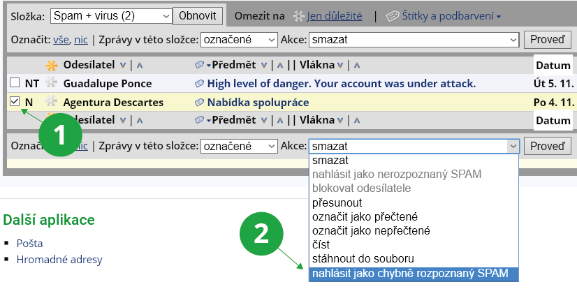 Máte-li naopak v seznamu kterékoliv jiné složky zprávu, kterou považujete za spam, přesuňte ji do složky „Spam + virus“ volbou „Nahlásit jako nerozpoznaný SPAM“. Příslušné zprávy (označené, neoznačené, všechny) se přesunou mezi ostatní spamy a zároveň se zařadí k dalšímu vyhodnocení. Přispějete tak ke zpřesnění rozpoznávání spamů spamovým filtrem.1 Označte dopis, který nepovažujete za spam.