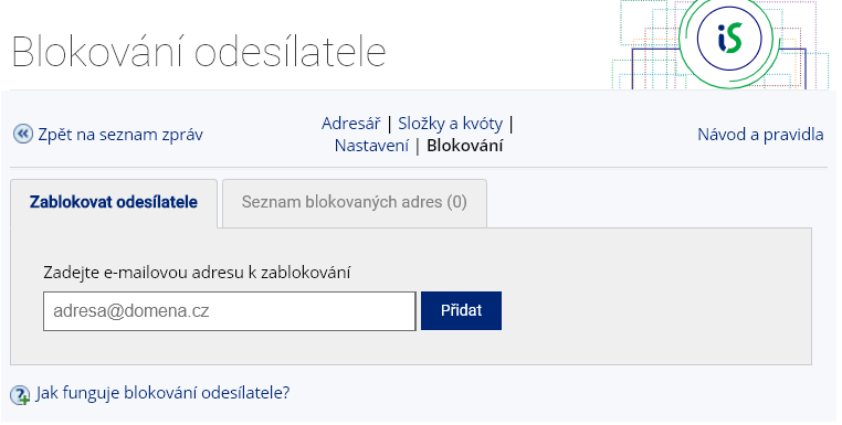 - 24.Jak mohu zablokovat e-mailovou adresu konkrétního odesílatele?Možnost zablokování adresy konkrétního odesílatele se nachází v aplikaci Pošta pod odkazem „Blokování“. V této aplikaci lze také seznam zablokovaných adres i spravovat. V aplikaci stačí zadat adresu, ze které nechcete již e-maily dostávat a kliknout na „Přidat“.