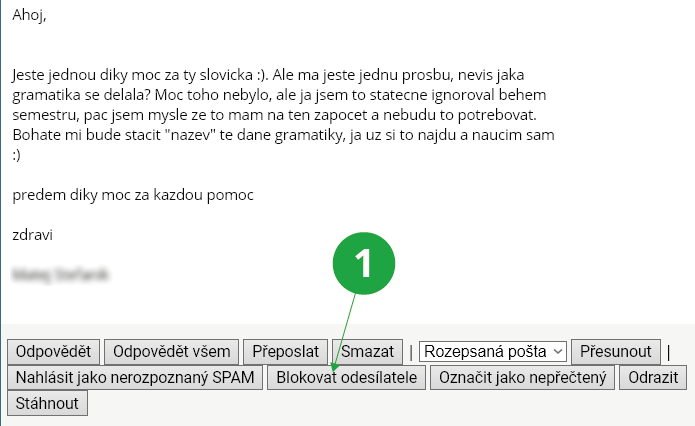 Po uložení blokované adresy se začnou příchozí dopisy z této adresy řadit do složky Spam + Virus, kde se po jednom měsíci automaticky smažou. Tuto funkci nemohou využít uživatelé, kteří mají svou poštu přesměrovanou na jinou adresu, protože se přesměrovaná pošta nekontroluje ani na spam, ani na blokování. Blokování funguje jen na konkrétní přesně zapsanou adresu, která se nachází v hlavičce Od (From) přijatého dopisu. Daná osoba Vám tedy může nadále zasílat dopisy z jiné (podobné) e-mailové adresy. Tato funkce není primárně určena pro řešení příchozího spamu. Spam označujte pomocí volby „Nahlásit jako nerozpoznaný SPAM“.1 blokování adresy přímo z doručeného e-mailu