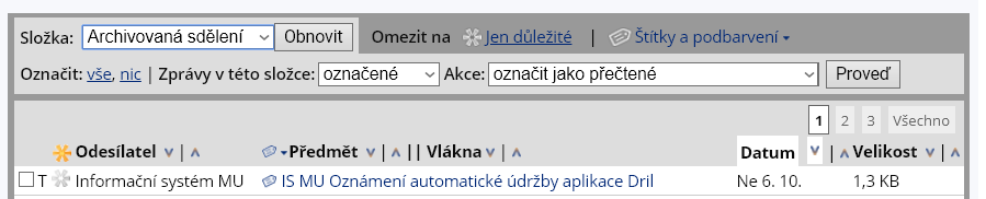 - 28.K čemu je složka Archivovaná sdělení?Do této složky se ukládají kopie některých zaslaných zpráv. Jedná o některá sdělení automaticky zasílaná Informačním systémem a o zprávy zaslané studijním odddělením nebo vyučujícími (pokud vyučující u zprávy označil, že se má archivovat). Zprávy uložené ve složce Archivovaná sdělení se nezapočítávají do kvóty velikosti mailboxu. Se složkou nelze manipulovat (mazat z ní zprávy). Složka slouží k možnému pozdějšímu prokázání či prověření, že vám určité sdělení bylo doručeno a jaký byl jeho přesný obsah.