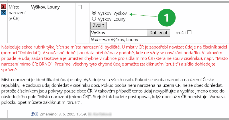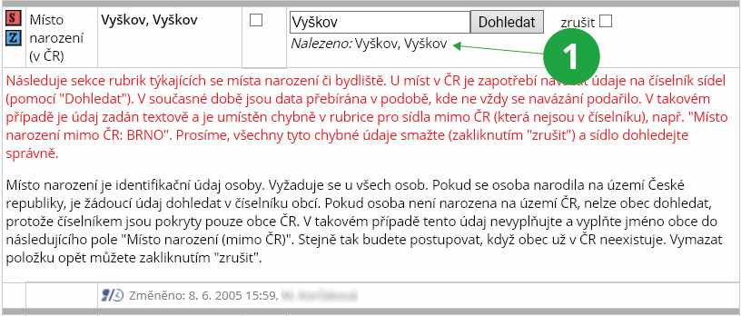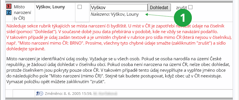 1 Špatně – za Nalezeno nesvítí správná obec, proto stiskněte Dohledat.