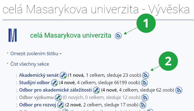 - 1.K čemu slouží RSS?Prostřednictvím RSS můžete odebírat nové příspěvky z vybraných aplikací IS UR (Diskusní fóra, Vývěska, Blogy ...), aniž byste se museli přihlašovat do systému. Jak to funguje? V aplikaci, která nabízí RSS zdroj, si zvolíte sekci, kterou chcete sledovat, a kliknutím na ikonku pro RSS si zvolíte přidání odběru. Pro čtení odběrů je vhodné používat RSS čtečku např. Feedly.com, odběry si ale můžete procházet i ve svém internetovém prohlížeči. Bližší informace o RSS lze najít ve Wikipedii.