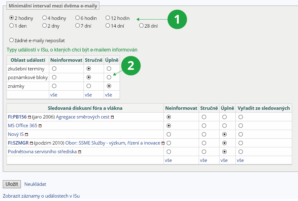 - 3.Jak si nastavím zasílání událostí e-mailem?Zasílání událostí e-mailem si můžete nastavit přesInformační systém Systém Nastavení systému Události Nastavení zasílání informací o událostech v ISu e-mailemZde si vyberte, o kterých událostech chcete být informování a jak podrobně. Stručné sdělení obsahuje pouze základní údaje pro identifikaci změny, úplné se pokouší přinést co nejvíce informací, klesá tím však přehlednost. Abyste nedostávali příliš mnoho e-mailů, můžete si nastavit časový interval mezi dvěma e-maily, a to v rozmezí od 2 hodin až po 28 dnů.