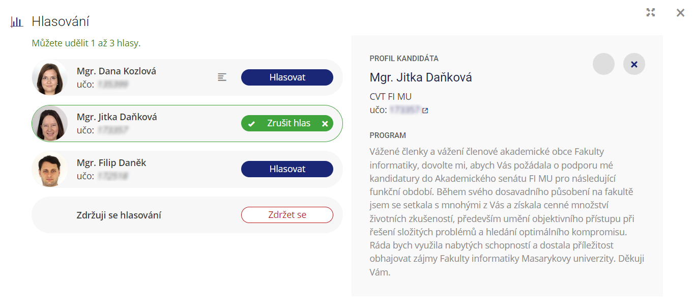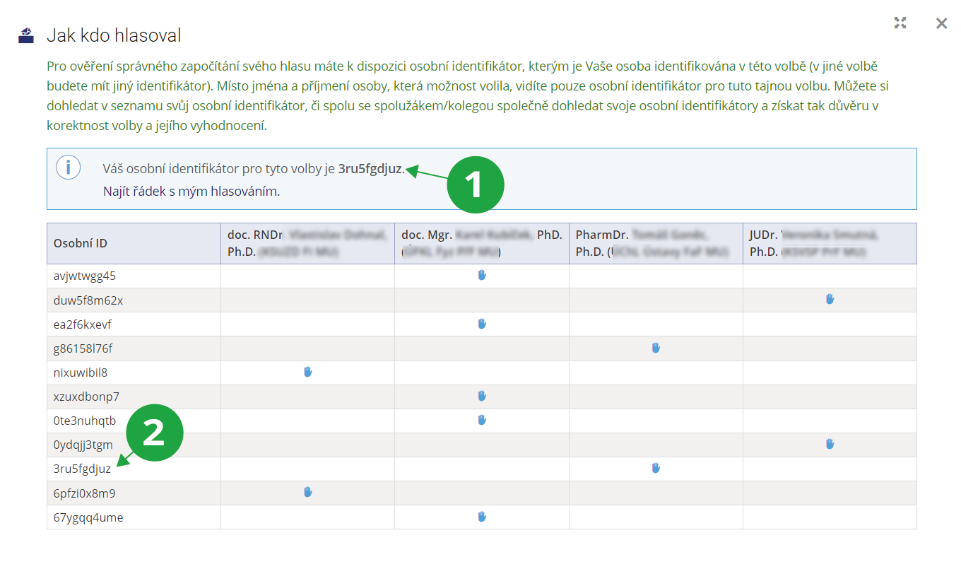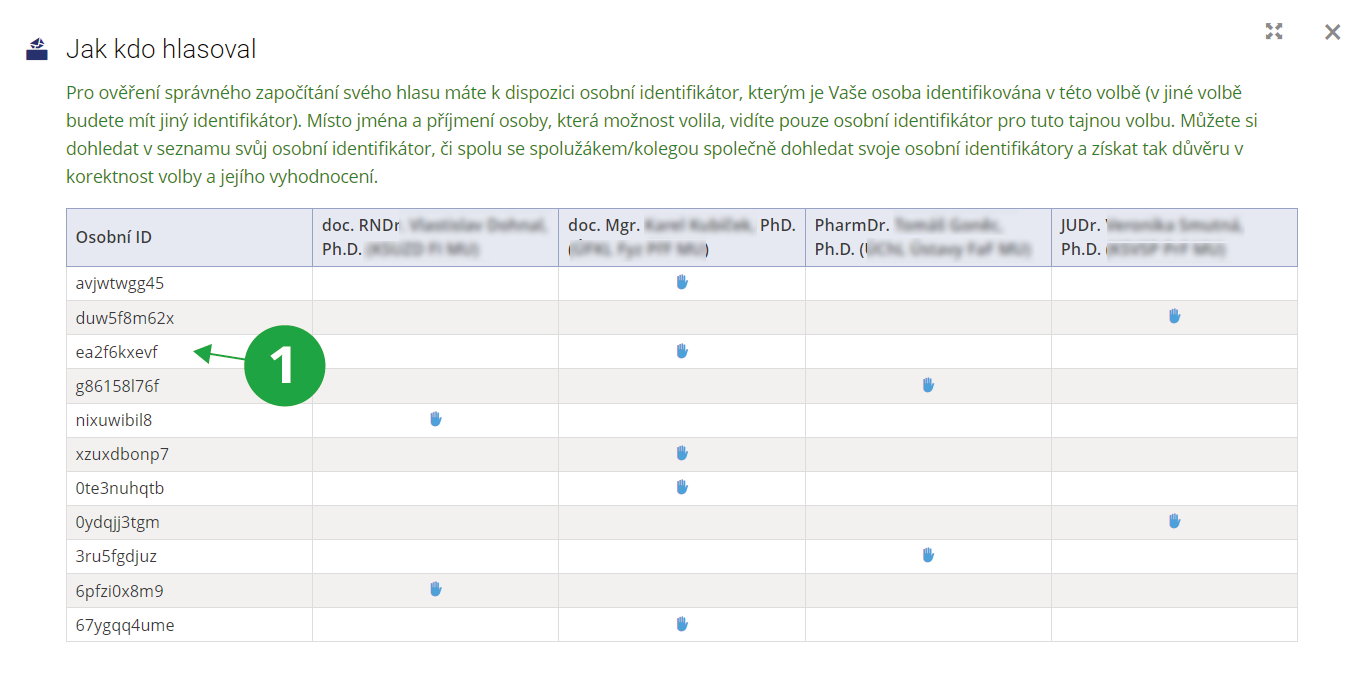 1 Místo jména a příjmení osoby, která možnost volila, je vidět pouze osobní identifikátor pro tuto tajnou volbu.