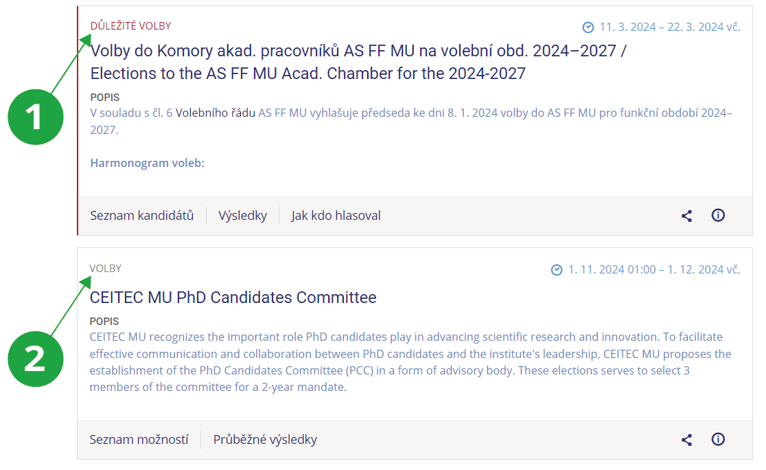- Volby stupně „důležité“ vyhlašují pouze majitelé práva y_vyhlasit_volbu. Právo se přiděluje na konkrétní fakultu, pracoviště, či celou školu. Právo přidělují provozovatelé Informačního systému na adrese uradovna@ismu.cz. Předpokládá se výjimečné přidělování tohoto práva. Vyhlašovatel volby stupně „důležité“ smí k volbě přiřadit hlasující jen z fakult či pracovišť, na která má explicitní právo. Vyhlašovatel volby stupně „důležité“ má právo hromadně obesílat hlasující e-mailem, jak všechny, tak i dosud nehlasující a ty, kteří už hlasovali. Může si také stáhnout seznam oprávněných voličů ve formátu PDF. Důležité volby se navíc zobrazují na titulní straně IS UR.