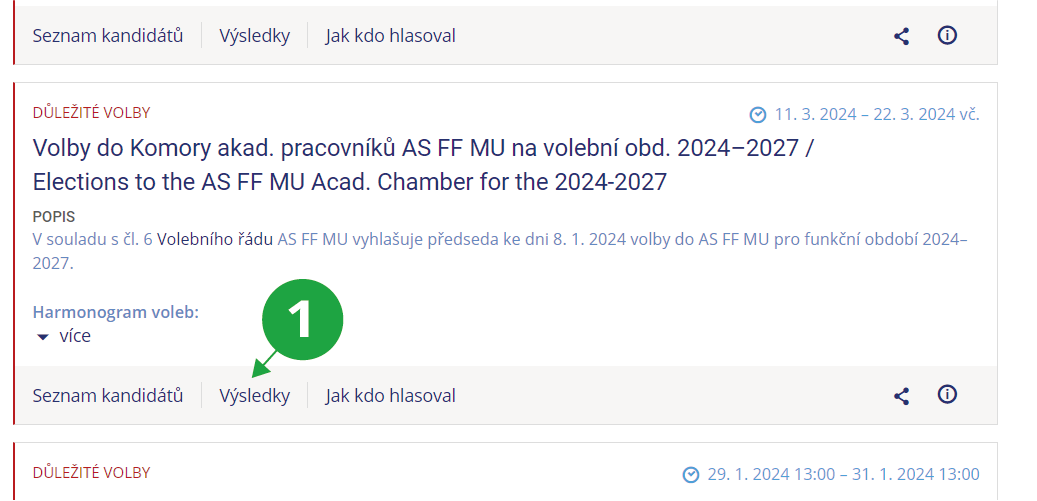 Vyhlašovatel i ostatní uživatelé, kteří mají k výsledkům přístup, naleznou výsledky po rozkliknutí vybrané volby v záložce „Výsledky“.