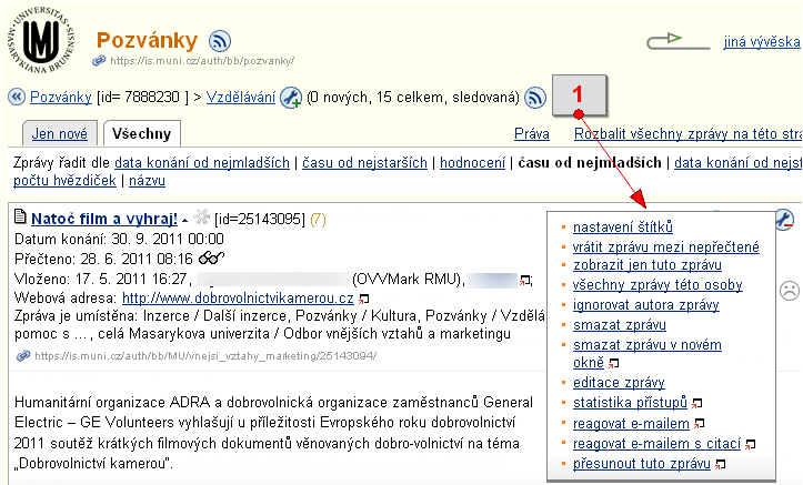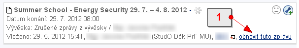 - 14.Rušení a expirace zpráv.Zprávy z vývěsky může zrušit jejich vkladatel a osoba s právem spravovat danou sekci, nebo zprávy automaticky expirují (mizí). Vkladatel zprávu zruší po rozkliknutí manipulačního klíče v pravém horním rohu dané zprávy volbou 'smazat zprávu'. Zprávám na Vývěskách se povinně nastavuje datum expirace (vypršení platnosti), zpravidla to bývá den po uplynutí avizované události. Expirované zprávy se přesouvají na zvláštní vývěsku Zrušené zprávy z vývěsky. Zrušené zprávy naleznete ve výpisu všech zpráv dané osoby. U kterékoli zprávy této osoby v pravém horním rohu rozbalte nabídku manipulačního klíče a zvolte 'všechny zprávy této osoby'.