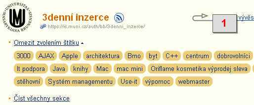 [1] odkaz na nastavení štítků v nabídce manipulačního klíče Veřejné štítky, které byly použity k označení zprávy, se nabídnou ve vybrané sekci Vývěsky k omezení zpráv v podobě tzv. mraku štítků.[1] mrak štítků Zprávy se štítkem naleznete vInformační systém Vývěska Moje zprávy (se štítkem) - 9.Jak si zapnu přeposílání nových zpráv z určité sekce Vývěsky e-mailem?Nejprve si vyberte Vývěsku nebo její sekci, ze které chcete být informováni o nových zprávách, a přidejte si ji mezi Sledované.Informační systém VývěskaNa konci stránky pod vybranou Vývěskou/sekcí zvolte pro sledování celé konkrétní Vývěsky 'Zařadit vývěsku mezi sledované' nebo pro sledování pouze určité sekce 'Zařadit aktuální sekci do sledovaných'. Poté se objeví odkaz 'Nastavit zasílání e-mailem přes Události', kterým vstoupíte do nastavení zasílání informačního e-mailu.