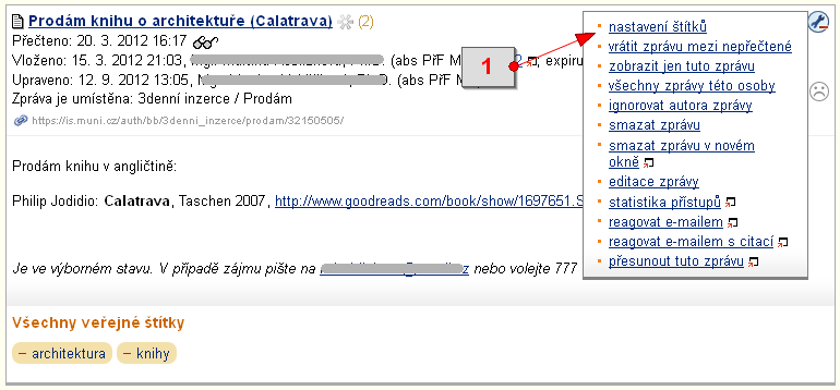 [1] označení zprávy hvězdičkou - 8.K čemu slouží štítky na Vývěsce?Štítky (poznámky) mohou sloužit k označení zajímavých zpráv nebo k propagaci zpráv na Vývěsce. Odkaz na vložení štítků se vám zobrazí ihned po vložení zprávy. Pro přidání štítků k cizí zprávě klikněte na manipulační klíč v horním rohu zprávy a vyberte 'nastavení štítků'. Zde můžete založit nový veřejný nebo soukromý štítek, nebo použít již jiný vytvořený.