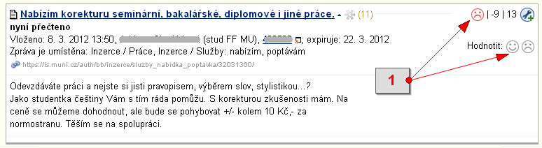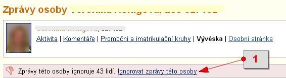 [2] aktivní zprávy - 15.Zprávy od určitých osob mne obtěžují.Nechcete-li číst zprávy na vývěsce od určité osoby, můžete osobu nechat ignorovat. Na vybrané vývěsce u autorovy zprávy klikněte vpravo nahoře na manipulační klíč a z nabídky vyberte volbu 'ignorovat autora zprávy'. Volbu znovu potvrďte tlačítkem 'OK'. Ignorování se váže na osobu, proto budou ignorovány všechny zprávy této osoby na všech vývěskách. Ignorování zpráv od zaměstnanců školy se uplatní až poté, kdy správci uznají, že je ignorování opodstatněné (např. hodně lidí žádá ignorovat zprávy dané osoby). Tip: U zpráv s nízkým skóre hodnocení (-10) se čtenářům přímo nabízí volba ignorovat autora. Máte-li tedy za to, že někdo vývěsku "spamuje", hodnoťte jeho zprávy - pomáháte tak další čtenáře na toto chování upozornit. Zprávy můžete hodnotit po jejich rozbalení výběrem z ikonek obličeje vpravo. Vaše hodnocení se pak zobrazí spolu s ostatními v pravém horním rohu vedle manipulačního klíče.
