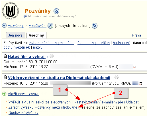 Pro snazší sledování zpráv, které se vás týkají, je užitečné přidat si danou Vývěsku, nebo jen některou její sekci, mezi sledované (pod výpisem příspěvků pomocí odkazu 'zařadit vývěsku