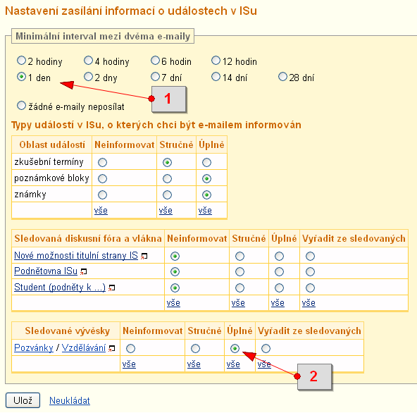 [1] nastavení zasílání e-mailu o nových zprávách V nastavení zvolte interval, ve kterém chcete dostávat informační e-maily o nových zprávách (minimálně lze 2 hodiny) a u sledovaných vývěsek/sekcí vyberte, v jakém formátu se mají informace posílat. Pro detailní výpis včetně textu nových zpráv označte políčko ve sloupci "Úplně". Pokud o některých vývěskách/sekcích nechcete být e-mailem informováni, ale máte je ve Sledovaných, označte políčko ve sloupci "Neinformovat". Zvolené nastavení na závěr potvrďte tlačítkem "Ulož".