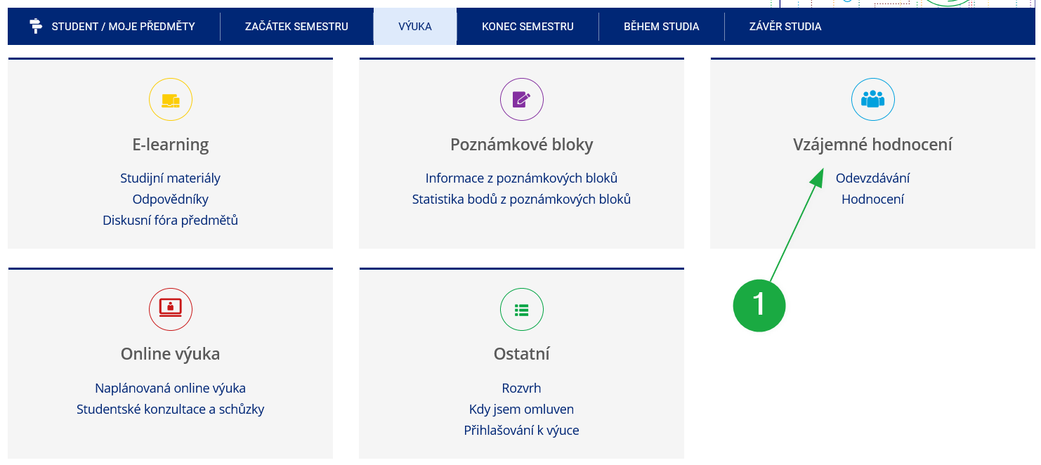 - 2.Jak se dozvím o vzájemném hodnocení v předmětu a jakou v něm mám roli?O účasti ve vzájemném hodnocení studenty informuje typicky vyučující, podobně jako u ostatních aktivit v předmětu. Pokud je to nastaveno, tak aplikace posílá odevzdávajícím či hodnotitelům e-maily o jejich roli ve vzájemném hodnocení. Součástí informačních e-mailů jsou všechny relevantní informace vztahující se k danému hodnocení. Všechna vzájemná hodnocení, která jsou vám určena v daném semestru, lze nalézt přes:Informační systém Student Výuka Vzájemné hodnocení