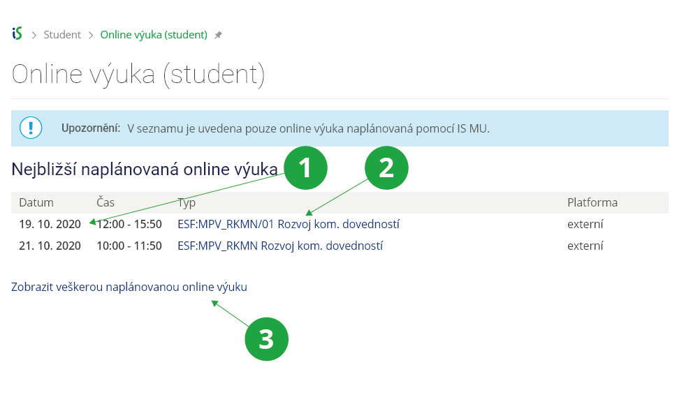 Informační systém Student [vybraný předmět] Online výuka1 Odkaz na rozcestník online výuky v předmětu, která byla naplánovaná pomocí IS UR.