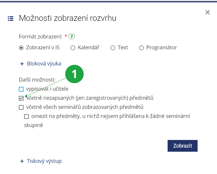1 Volba typu rozvrhu. Označením této možnosti se v rozvrhu vypíší i pouze zaregistrované předměty.