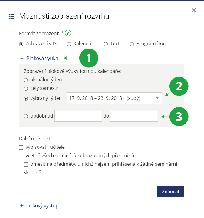 - 5.Jak si můžu zobrazit rozvrh na určité období?V rozvrhu si mohou studenti a učitelé zobrazit jak celý rozvrh, tak i jen aktuální týden za pomoci přepínače v pravo nahoře. Potřebujete-li zobrazit i tzv. blokovou výuku, potom v rozvrhu zvolte „Možnosti zobrazení“, kde uvidíte rozklikávací dialog „Bloková výuka“:Informační systém (Kalendář) Můj rozvrh Možnosti zobrazení Bloková výukaZ menu si můžete vybrat konkrétní týden, který chcete zobrazit. Z kalendáře lze vybrat i jiný rozsah dní nebo týdnů.