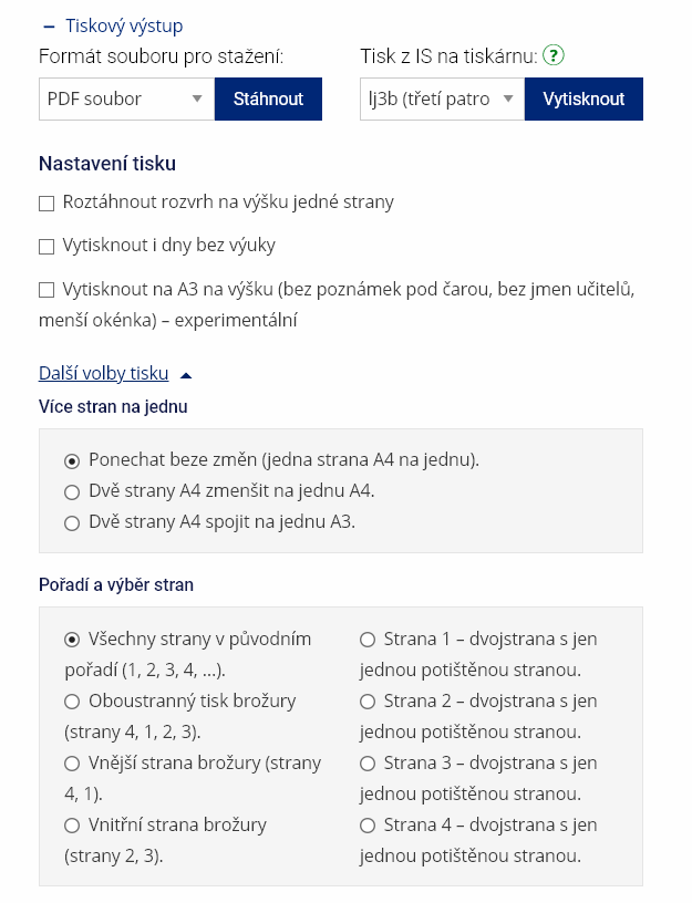 - 4.Jak si mohu vytisknout/stáhnout rozvrh?Zobrazte si požadovaný rozvrh a zvolte „Možnosti tisku“ (vpravo nahoře). Zde si můžete vybrat, zda chcete tisknout přímo na zvolené tiskárně nebo stáhnout soubor PDF pro tisk: