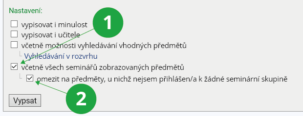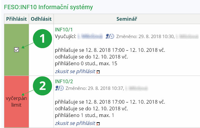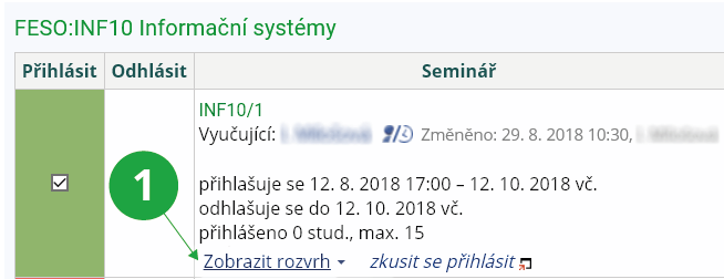 2 Volba zobrazí všechny semináře předmětu, kde nejste přihlášen do žádné skupiny.