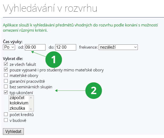 - 6.Jak najdu předměty, které se mi hodí do rozvrhu?Pomocí aplikace „Najít předmět v mém volnu“, ke které se dostanete přes:Informační systém Rozvrh Další rozvrhy a rezervace Najít předměty v mém volnuVyhledávání v rozvrhu můžete omezit podle různých kritérií, např. pouze předměty mateřských oborů, bez seminárních skupin, podle typu ukončení apod.