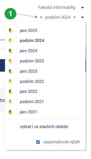 - V aplikaci „Přihlašování/odhlašování seminárních skupin“ si zkontrolujte v záhlaví správnost nastavení aktuálního období (např. „podzim 2024“).