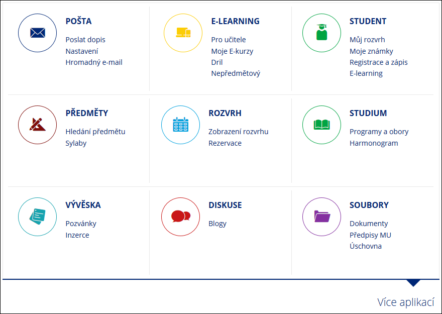 - 5.Hlavní studentské aplikaceNa titulní straně jsou vybrány všechny pro vás důležité agendy a aplikace. Měli byste tak přehledně najít vše, co potřebujete na počátku užívání systému. Později si můžete například dle vlastních potřeb upravit odkazy zobrazované v levém sloupci.