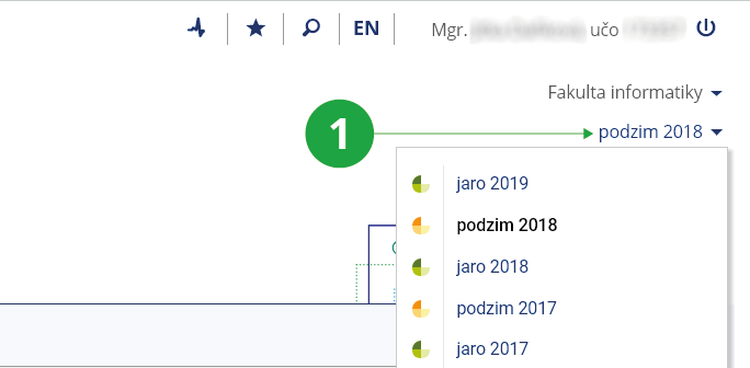 zrovna nacházíte. Pokud si registrujete předměty, hledáte zkušební termíny apod., věnujte pozornost tomu, jaký semestr (období) máte zvoleno. Změnu provedete kliknutím na semestr.