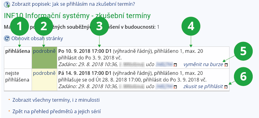 - 6.Co znamenají jednotlivé údaje?Kliknutím na název předmětu získáte seznam termínů, které jsou pro daný předmět vypsány. U každého termínu jsou vypsány podrobné informace, např. o místu konání, o počtu přihlášených studentů apod.