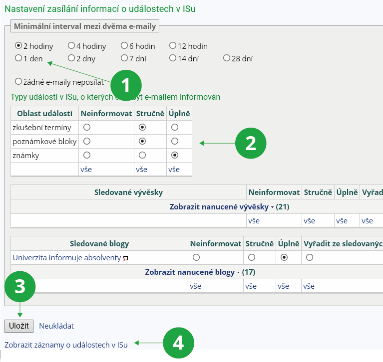 - 8.Mohu si nechat posílat změny v hodnocení e-mailem?Ano. Informační systém vám dovoluje si zapnout automatické zasílání změn vašich známek. Tuto volbu si můžete nastavit v aplikaci:Informační systém Systém Nastavení systému Události Nastavení zaslání informací o událostech v ISu e-mailemV nastavení si můžete zvolit interval, ve kterém chcete dostávat informační e-maily o nových známkách (minimálně lze 2 hodiny). Nastavit lze i formát výpisu - stručný nebo úplný. Stručný výpis obsahuje pouze základní údaje pro identifikaci změny, úplný se pokouší přinést co nejvíce informací, klesá tím však přehlednost. Zvolené nastavení na závěr potvrďte tlačítkem „Uložit“. Kromě změn ve známkách si můžete nastavit také sledování změn v poznámkových blocích nebo ve zkušebních termínech.