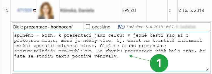 Při editaci obsahu máte řádek obsahující jméno studenta, studované obory, způsob ukončení předmětu a hodnocení, má-li již zadáno. Pokud máte současně