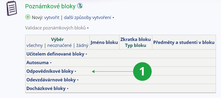 Záznamníku učitele zvolte bloky, se kterými chcete následně pracovat, nebo vytvořte nový blok.