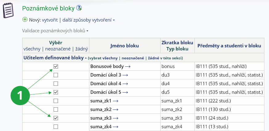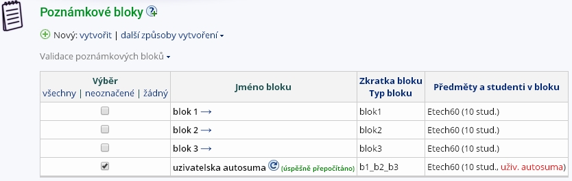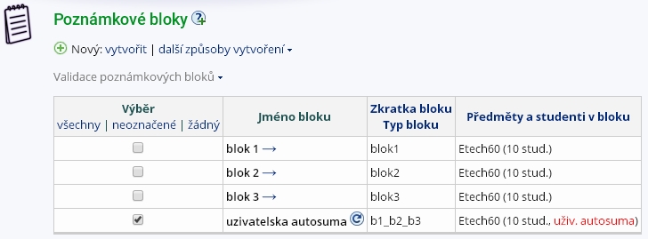o validaci). Blok můžete vytvořit zároveň ve více předmětech (vstupte do aplikace s více předměty najednou).