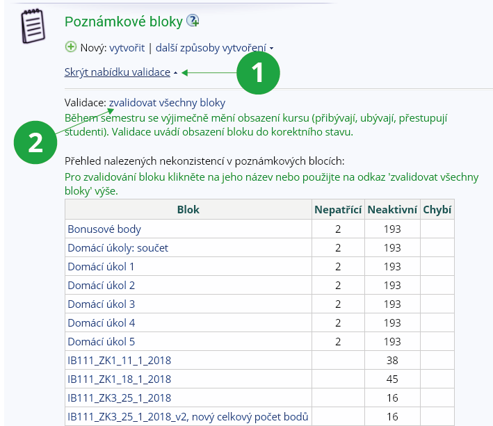 Nezakládejte (není-li nutno) bloky v prvních týdnech semestru, kdy seznam studentů v kurzu není úplný, nebo následně použijte validaci (viz též níže,