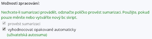 Přejete-li si, aby se výsledný blok uživatelské sumarizace pravidelně aktualizoval (typicky při změnách proměnných ve zdrojových blocích), je možné při jeho zakládání zatrhnout volbu „vyhodnocovat opakovaně automaticky“. Výsledný blok se pak přepočítává pravidelně každou hodinu.