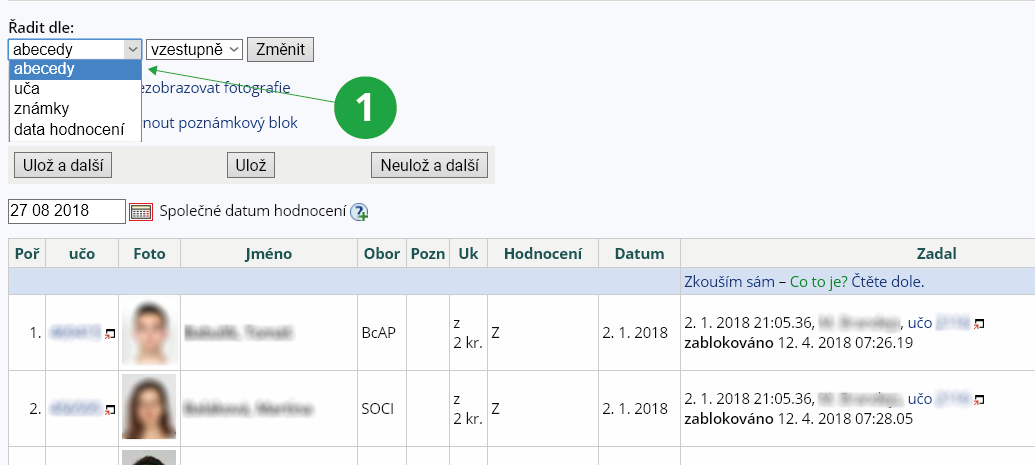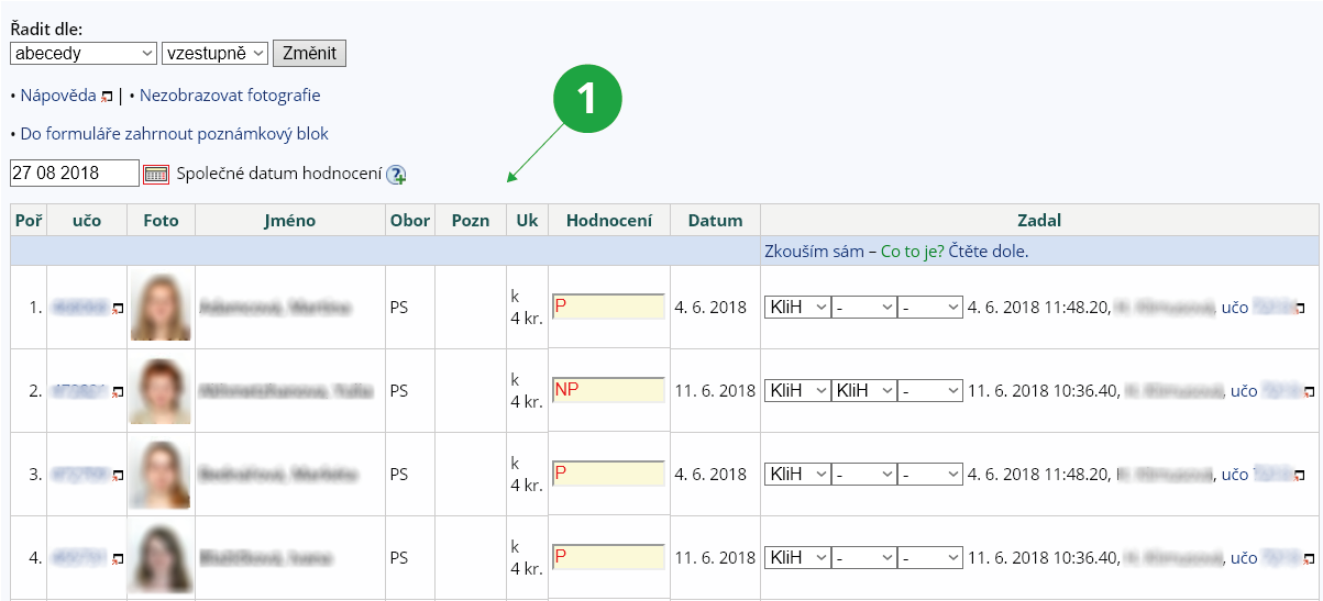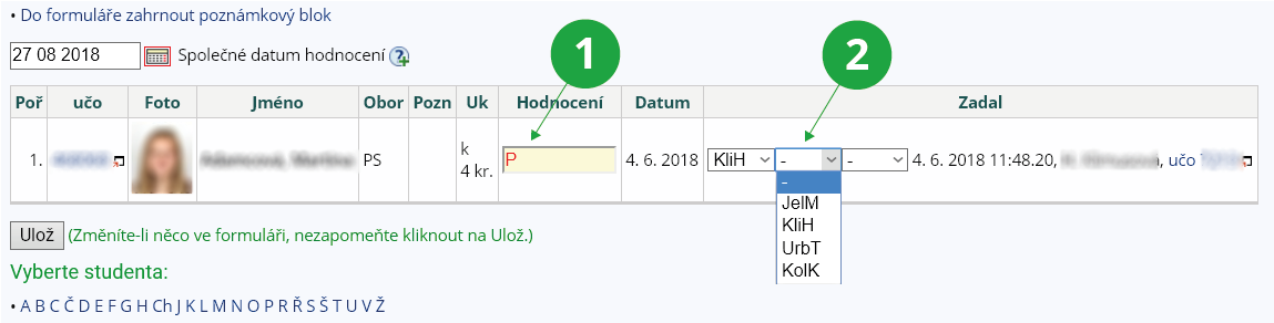 1 Zadávání hodnocení studentům jednotlivě.