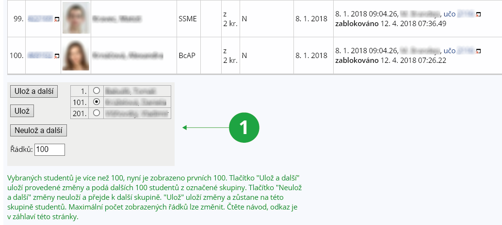 - 7.Listování seznamem studentůDo formuláře se zařazuje nejvýše zadaný počet (např. 100) řádků. Pokud je vybráno více než 100 studentů, zobrazí se pouze prvních 100. Změňte hodnocení těm, kteří jsou ve vypsané části formuláře, přejděte dolů a máte k dispozici tato tlačítka: „Ulož a další“ uloží změněné známky a přejde na další označenou skupinu studentů. „Neulož a další“ neuloží změny a přejde na další označenou skupinu studentů. „Ulož“ pouze uloží změněné známky a zůstane ve stejné vybrané skupině studentů. Pokud na některém řádku známku nezadáte nebo nezměníte, pak se po stisku „Ulož“ s tímto údaji na tomto řádku nic neděje.