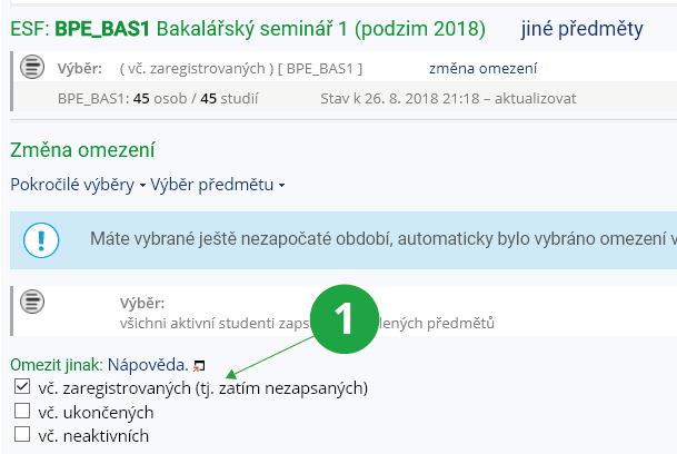 - Počet studentů/počet studií, kterým byl předmět oficiálně studijním oddělením zapsán. Počet zapsaných studentů je vždy menší nebo roven počtu zaregistrovaných studentů. Pokud je zapsáno příliš málo studentů (vzhledem k počtu zaregistrovaných), pak studijní oddělení dosud nepotvrdilo zápis. Tuto situaci si vyjasněte se svým studijním oddělením. Učitel má právo v řadě aplikací pracovat i se seznamem zaregistrovaných studentů. Provede to tak, že spolu s výběrem předmětu zaškrtne na výběrové stránce políčko „vč. zaregistrovaných (tj. zatím nezapsaných)“. Pokud chcete nastavení tohoto typu změnit, klikněte nahoře na „jiné předměty“ vedle kódu a názvu předmětu. Podrobnosti o možnostech omezení seznamu studentů najdete v této Nápovědě. Pokud dlouho zůstanou studenti nezapsáni, je to špatně. Nezapsaní studenti se nepřihlásí ke zkoušce, nezapsaným studentům nezadáte známku. Do počtu zapsaných a zaregistrovaných studentů se počítají pouze aktivní studenti. Pokud některý ze zapsaných nebo zaregistrovaných studentů přeruší či ukončí studium, sníží se počet zapsaných a zaregistrovaných.