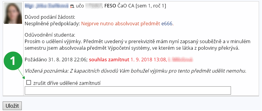 - 4.Chci vzít zpět zamítnutou výjimku, jak to udělám?V aplikaciInformační systém Učitel [výběr předmětu] (Studenti) Registrace: udělování výjimekzaškrtněte políčko „zobrazovat i vyřízené žádosti“ a klikněte na „uplatnit“. Zobrazí se vám seznam studentů, kteří žádali o výjimku. U studentů, kteří mají výjimku zamítnutou, zaškrtněte políčko „zrušit dříve udělené zamítnutí“ a uložte. Nyní můžete znovu udělit souhlas se zápisem předmětu.