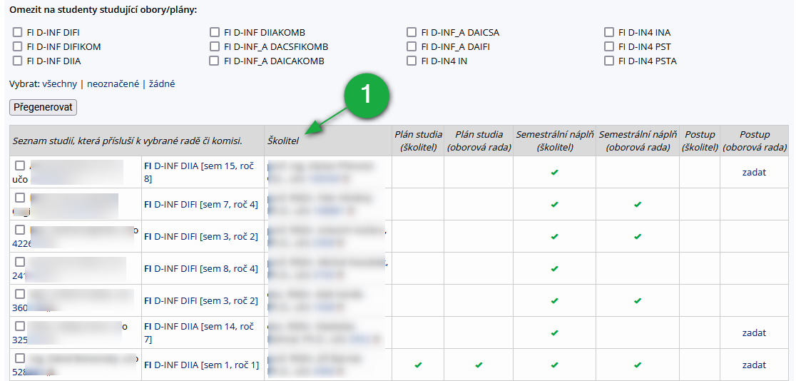 1 Člen oborové rady může skrze seznam studentů vyhledat údaje zadané školitelem. Předseda vidí navíc odkaz pro editaci dané rubriky.