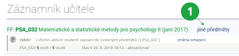 - 1.Jak přejdu v Záznamníku na jiný předmět, jiný semestr?Pro výběr jiného předmětu klikněte na možnost „jiné předměty“ vedle názvu předmětu.