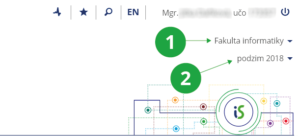 V pravém horním rohu stránky pak kliknutím na ikonu před názvem fakulty můžete změnit výběr fakulty, stejně tak lze změnit období pomocí ikony před jeho názvem.1 Odkaz „jiné předměty“ pro výběr jiného předmětu.