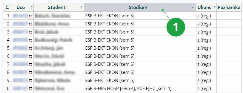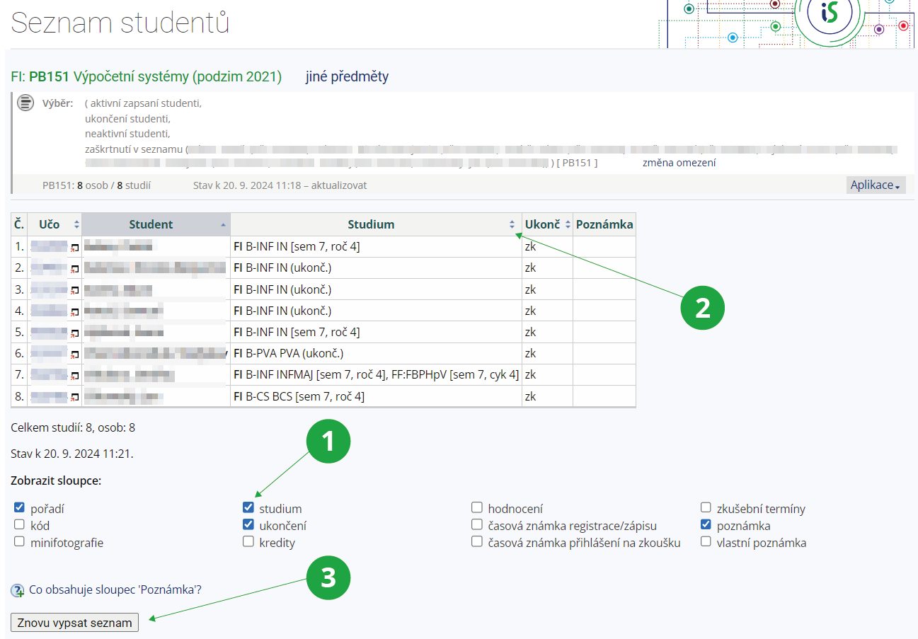 Se seznamem studentů můžete dle potřeb dále pracovat. Můžete si vybrat, jaké sloupce se vám budou v seznamu zobrazovat např. minifotografie, seminární skupiny, hodnocení apod. Zvolit si můžete také způsob řazení seznamu.1 Odkaz na seznam všech studentů předmětu.