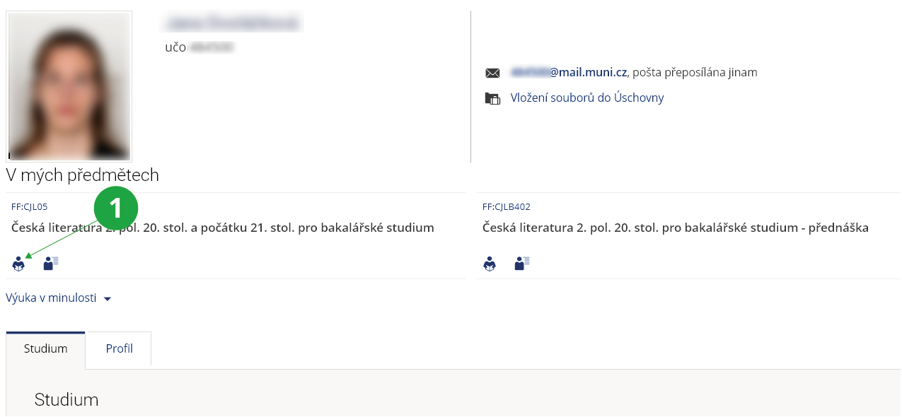 Druhou variantou je sekce Individuální informace o studentovi v Záznamníku učitele, kde se vám zobrazí abecední seznam všech studentů vybraného předmětu. Pak už stačí jen kliknout na jméno vybraného studenta.1 Sekce V mých předmětech v aplikaci Lidé.