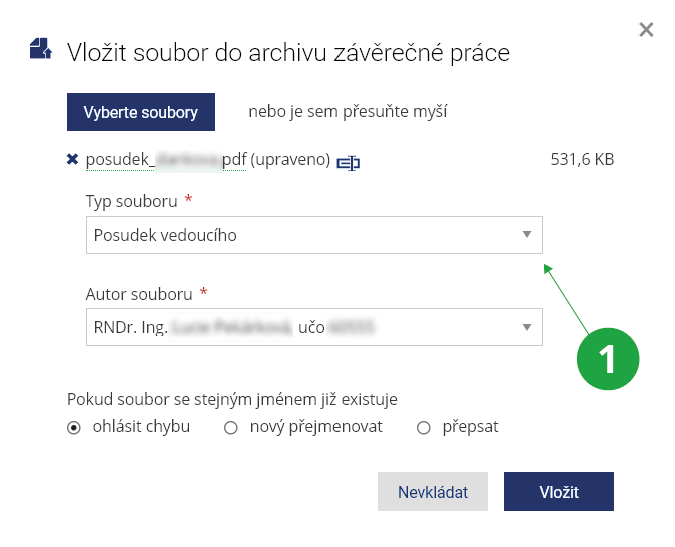 V typu nahrávaného souboru vyberte „Posudek vedoucího“, jako autora souboru ponechte své jméno. Doporučujeme nazvat soubor jako posudek_jmeno nebo posudek_uco. Vyplněné údaje potvrďte tlačítkem „Vložit“.1 Vstup do archivu závěrečné práce.