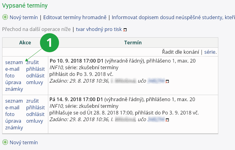 - Tato volba zobrazí jména a uča studentů, kteří jsou přihlášeni na daný zkušební termín.