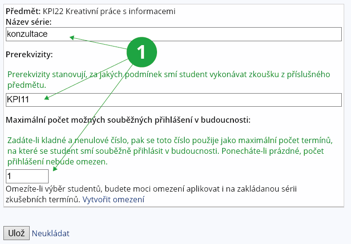 - Kapacita termínu. Pokud sdílíte zkušební termín s více předměty, můžete zde zadat sdílenou kapacitu termínu.