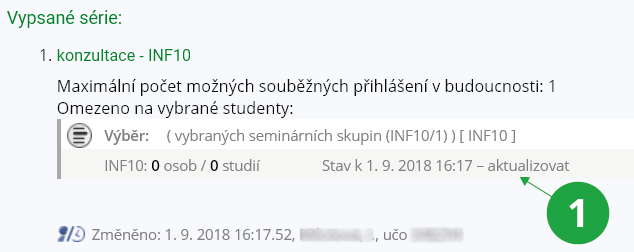 Pokud chcete omezit přihlášování např. pouze na studenty, kteří již mají splněný určitý předmět, můžete tak učinit prostředictvím prerekvizit, které také nastavíte u série termínů. Studenty, kteří nesplňují omezení série termínů vybraného předmětu, můžete najít a odhlásit přes:1 Volba pro aktualizaci omezení série.