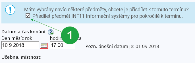 Je-li nutné, aby proběhla časová soutěž studentů o výhodnější termíny, vyplňte den „přihlásit od“. Přihlašování vypukne v tento den od 17:00. Je-li vyplněno „přihlásit od“, pak musí být zaškrtnuto i „na tento termín se studenti mají přihlašovat“. Zůstane-li položka „přihlásit od“ prázdná (doporučený postup), nebude docházet ke studentským klikacím soutěžím (studenti nebudou vědět, kdy přesně přihlašování spustíte).