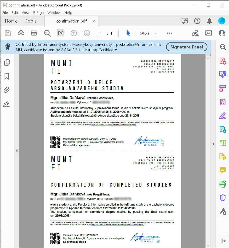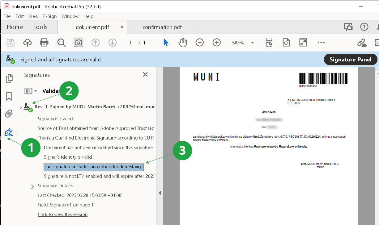 1 Ukázka zobrazení elektronicky podepsaného dokumentu v Adobe Acrobat programu.